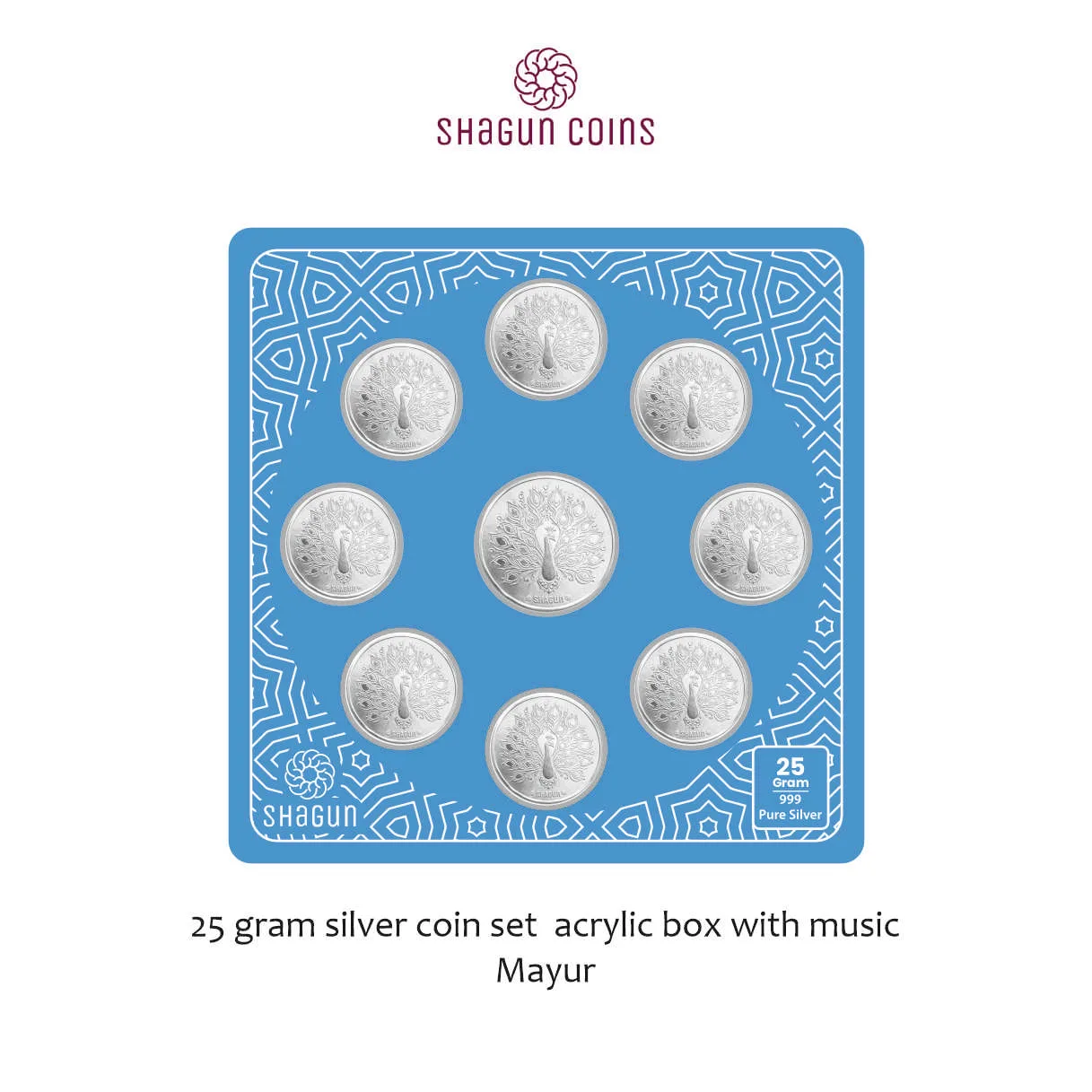 | Product Name | 25 GRAM SILVER COIN SET ACRYLIC BOX WITH MUSIC - Mayur |